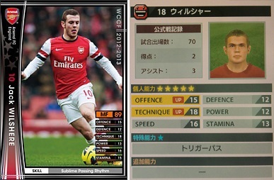 ・今回は最初から控えで起用するつもりだったので結果は求めてませんでした。ボランチや左MF、トップ下など幅広く起用しました。守備ではフラミニ以上にガツガツ行きます。センターラインより前まで行ってプレスしちゃいますが、戻りは遅いので一度抜かれたら厳しいかも。たまに全力ダッシュで帰ってくる事もありますが、フラミニよりは奪えません。奪った後は持つ事が多いのでWCCF的には厳しいかも。思い立ったら即行動な男なので、急に前線へ全力ダッシュしてたりします。そのまま、ゴールまで行けよってところで横パスしたりと面白いです。弱点は非常に奪われやすいこと。自陣で囲まれた際にはある程度抜いてくれるのでいいのですが、相手陣地で離さないのが玉にキズ。ボランチで起用なら大丈夫かも。後はスタミナが非常にネックで90分持ちません。レア戦術「チャイルドキング」が無いウィルシャーだと使い勝手は難しいかも。
