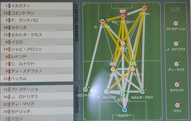 ・こんなにも黄金連携にしたってのにイマイチだったんだよねー。一応、ディ・ステファノを中心に黄金にしてみました。なので、結局は縦パスを当ててディ・ステファノやロナウドに頑張らせるという格好でした。こうやってメンバーを並べてみると、あんまりバランス良くなかったんですね。意外と中盤でボールを奪えないし、力強さが無いし、最終ラインで奪って中盤で奪われるってのも多かったなぁ。