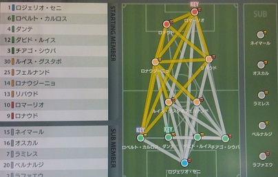 ・ロマーリオ重視のチームゆえに黄金連携もこれでもかと繋ぎましたよ。前の4人はぎっちりと固めておきましたが、パスワークのチームではないので意外と黄金連携っぽくは無く。ほとんどが足元から足元へっていうパスばかりになっちゃいました。戦術SPの時はスルーパス出すけども、それは別にこのチームじゃなくても出すしね。