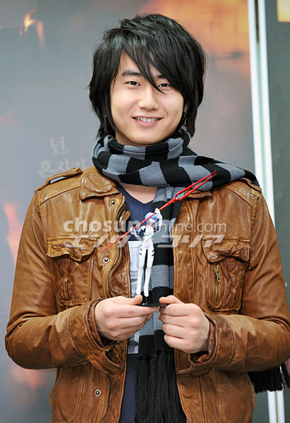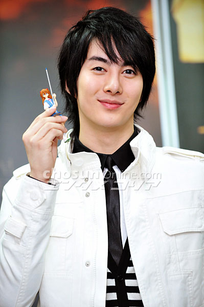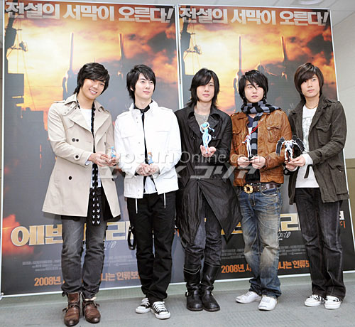 17日夜8時、ソウル市竜山区の映画館「竜山CGV」で開かれた、日本のアニメ映画『ヱヴァンゲリヲン新劇場版:序』の試写会とフィギュア展示会に出席したPR大使のSS501が、キャラクターのフィギュアを手ににこやかに明るく笑いながら写真撮影に応じている。