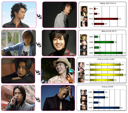 女好きのカサノバ「西門総二郎」役は童顔スターたちの間で接戦を繰り広げた結果、ドラマ『コーヒープリンス1号店』で脚光を浴びたキム・ドンウクが支持率28%で1位。「美作あきら」役には映画『強敵』で脱走犯イ・スヒョン役を演じ、独特の魅力を発揮したチョン・ジョンミンが支持率49%で1位に選ばれた。