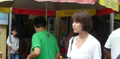 ドラマ撮影現場でファンが撮った写真の中のソン・ヘギョは、これまでのロングヘアをバッサリと切り、短めのボブスタイルになっている。