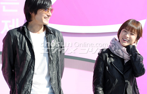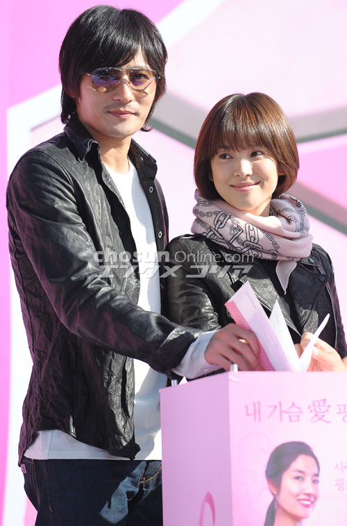 写真はイベント参加者と記念撮影する化粧品メーカー「アモーレ太平洋」のイメージキャラクター、ソン・ヘギョとチャン・ドンゴン。