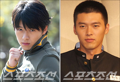 左の写真は2003年デビュー当時の姿。右の写真は『友へ チング、俺たちの伝説』の制作発表会で、短髪になって現れたヒョンビン。