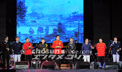 31日午後6時、国立ソウル顕忠院(ソウル市銅雀区銅雀洞)内の野外特設ステージで「2009護国音楽会」が行われた。写真は、熱唱している芸能人兵士たち。