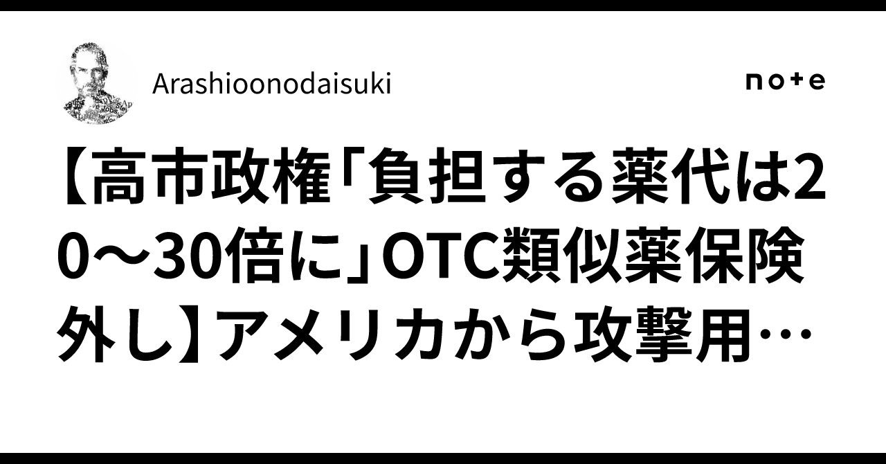 【高市政権「負担する薬代は20~30倍に」OTC類似薬保険外し】アメリカから攻撃用無人機大量購入?防衛費増で狙われる医療費~「金がない病人は勝手に死ねば」高額療養費制度改悪、がん患者「私たちを殺さないで|Arashioonodaisuki【高市政権「負担する薬代は20~30倍に」OTC類似薬保険外し】アメリカから攻撃用無人機大量購入?防衛費増で狙われる医療費~「金がない病人は勝手に死ねば」高額療養費制度改悪、がん患者「私たちを殺さないで」~ ■「負担する薬代は20~30倍に」高市政権で医療費負担増の懸念…維新と連立で「OTC類似薬の保険適用外」 女性自身 2025…note.com