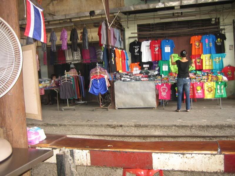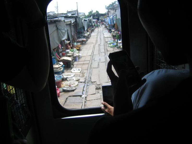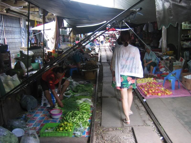 市場の中を線路が通っています。列車が来ると商品や傘をどかせて列車を通します。