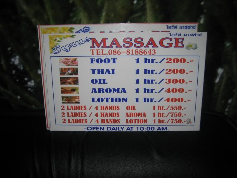 これが、この店の料金表ですが、一番高いのが"2 LADIES / 4 HANDS LOTION (またはAROMA)" 1 hr./750B となっています。