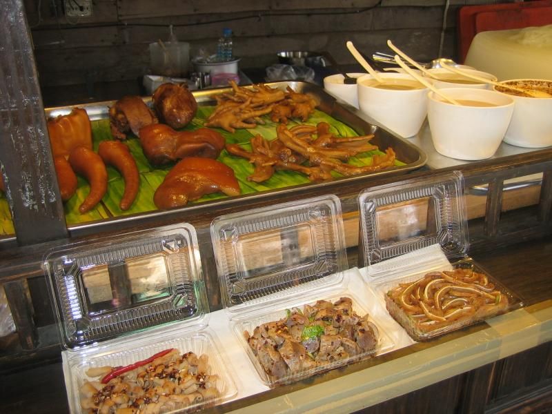 鳥(下の足はアヒル、上のは鶏)の足、豚の耳と舌。左の細長いのは、豚のイチモツでしょうか?