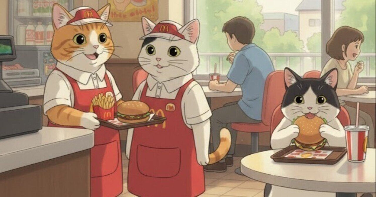 〇ックでアルバイトするタイガとココア、ハンバーガーを食べるオレオ🍔