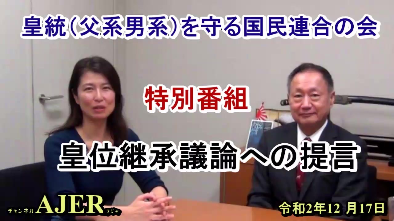 (特別番組)「皇統(父系男系)を守る国民連合の会_「山田宏参議院議員に訊く「『立皇嗣の礼』を終えて、今後の皇位継承議論への提言」」葛城奈海 AJER2020.12.17(1)