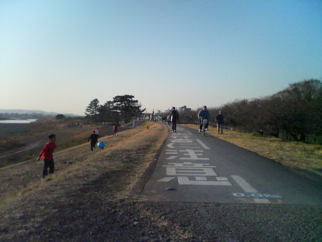 散歩する人、走っている人、凧揚げをする家族連れなどでけっこうにぎわっています