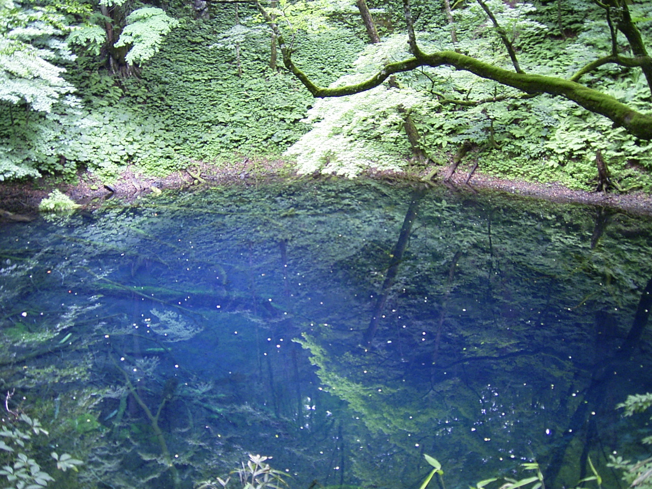 十二湖駅下車、路線バスに乗り換えて20分ほど行くと津軽国定公園に入っていった。あちこちに湖があらわれる。一番奥に「青池」はあった。