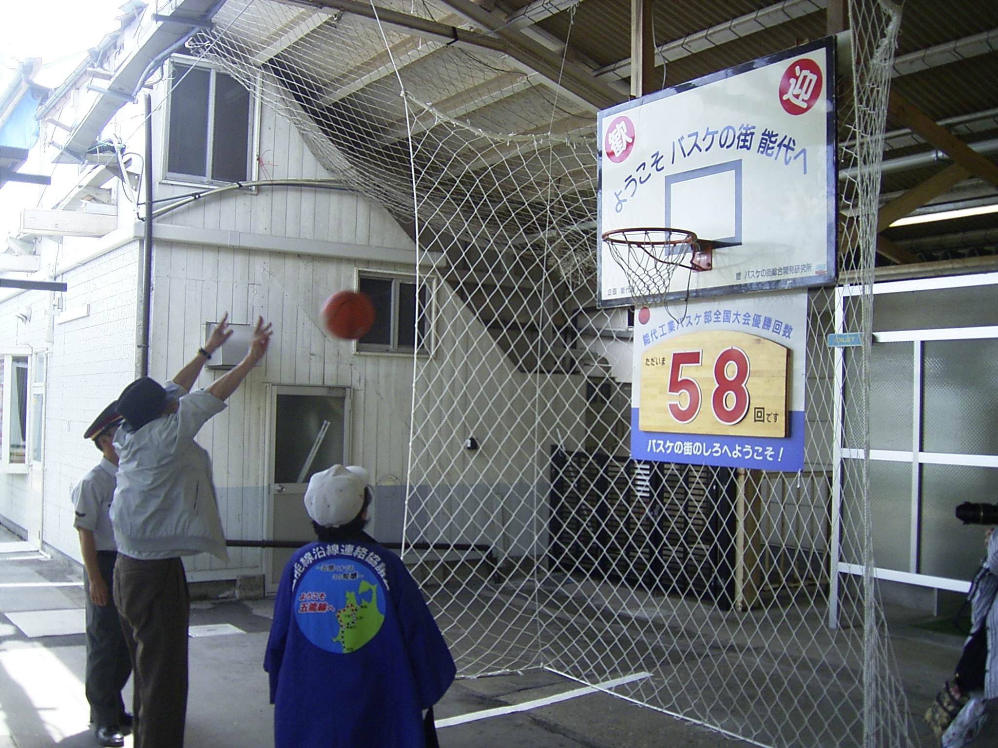 能代駅で5分停車。「ホーム特設のパスケのリングに見事シュートできた方には景品を差し上げます」と車内アナウンスが。さすがにバスケで全国区となった街だけあって企画がおもいろい。2回チャレンジして2回ともゴールを決めたこともあって楽しい旅のスタートとなりました。