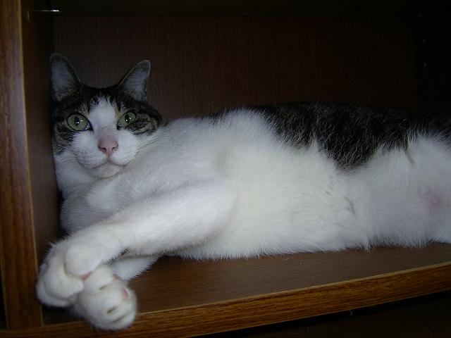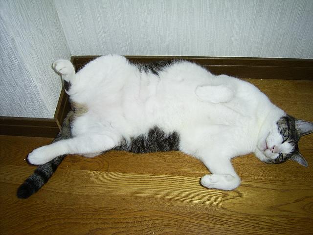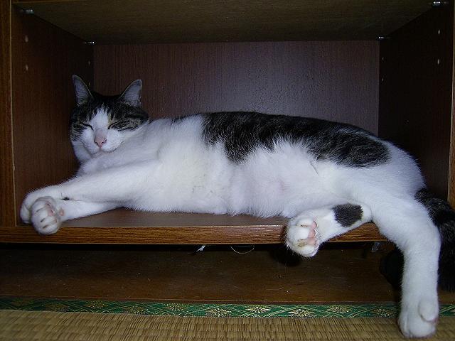 今日も暑いなあ。でも、大阪の方がもっと暑かったなあ。こんな日はこの板の間がいちばん気持ちイイんだ。