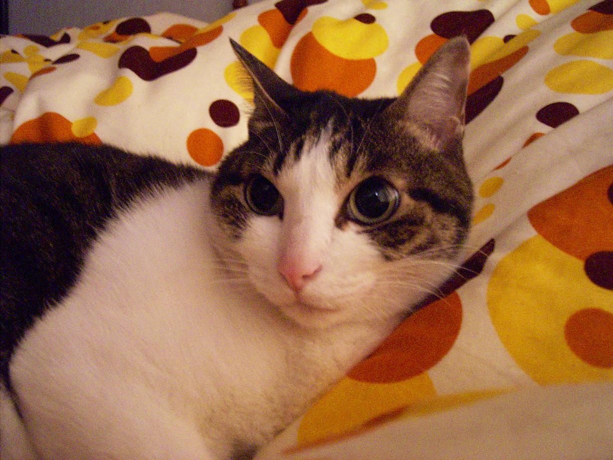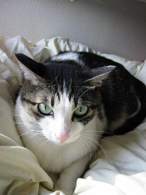 さいきん、だいぶ暖こうなってきたけど、夜はまだ寒い。ベッドにもぐって寝んとカゼひくわ。ときどきご主人の上に乗って寝るんやけど、かなり迷惑らしいわ。寝返りが打てんって。