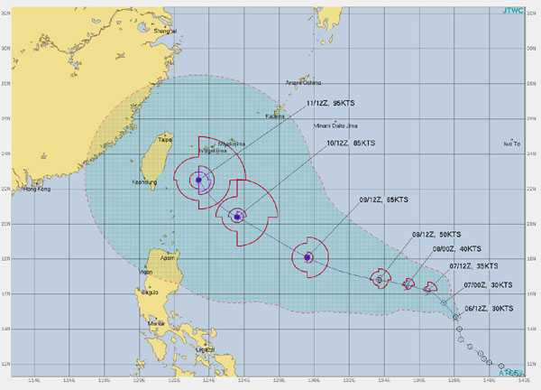 ただ発達具合は違いが多く、米軍は台湾付近で130ノット(秒速67m)まで発達すると予想されています。