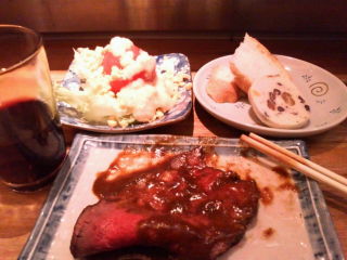 立ち呑み蕎麦屋なのに、ワインとかローストビーフとか用意してくれて、皿とグラスは渋い