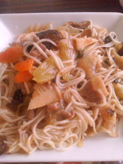 宮城の白石温麺(しろいしうーめん)を、お母さん手作り中華丼の具と炒めて作りました