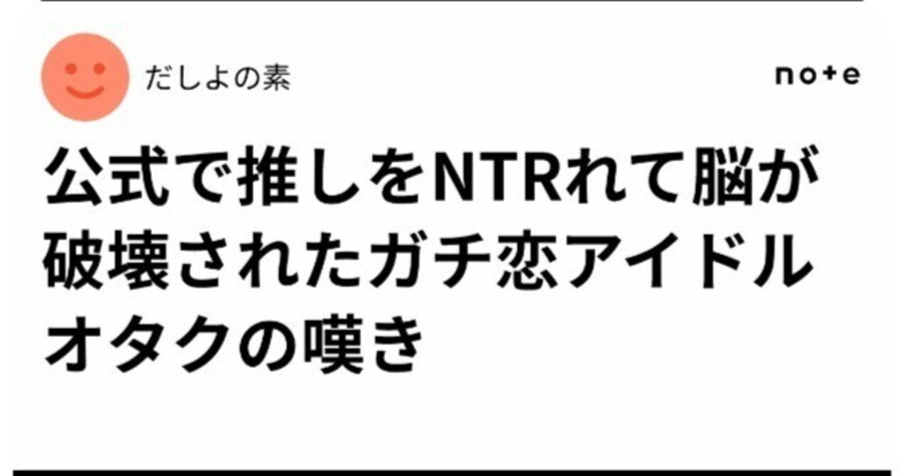 ガチ恋アイドルオタクの嘆き先日同僚に話したらウケてたのでいっそ振り切ったこと書いたら面白いかなと思って書きました。https://note.com/dashiyonomoto/n/n86005f39fd36 公式で推しをNTRれて脳が破壊されたガチ恋アイドルオタクの嘆き|だしよの素こんにちは。 先日、同僚(オタク)たちと「どうしても許せない公式設定って、人の数だけ存在するよね」という話をしました。 性癖が人の数だけ存在するように、地雷も人の数だけ存在する。 自分はアイドルオタクなので最初は特段思い当たらなかったのですが、同僚の「許せない…!」という叫びから思い当たったものが1つ。 皆様は「BEYOOOOONDS」というグループ…note.com