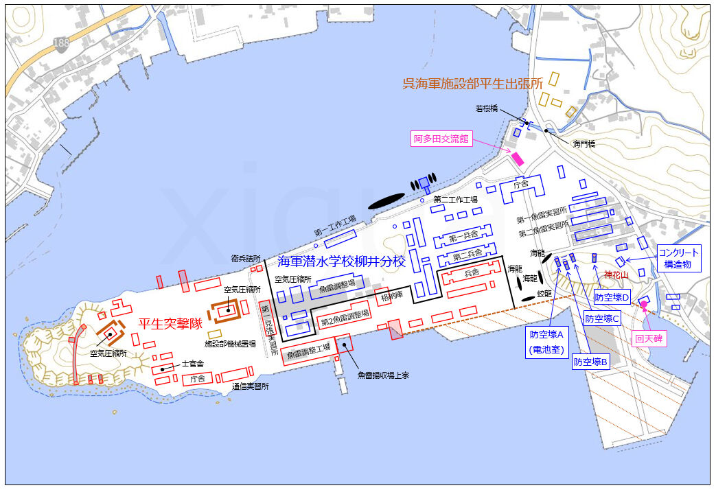 青色が柳井分校の施設となります。赤色が平生突撃隊ですが、こちらは人間魚雷「回天」の訓練基地となります。昭和20年3月1日、柳井分校に隣接する形で開設されました。さらに半島付け根の北側には、資材や木材を保管する呉海軍施設部平生出張所が置かれていました。