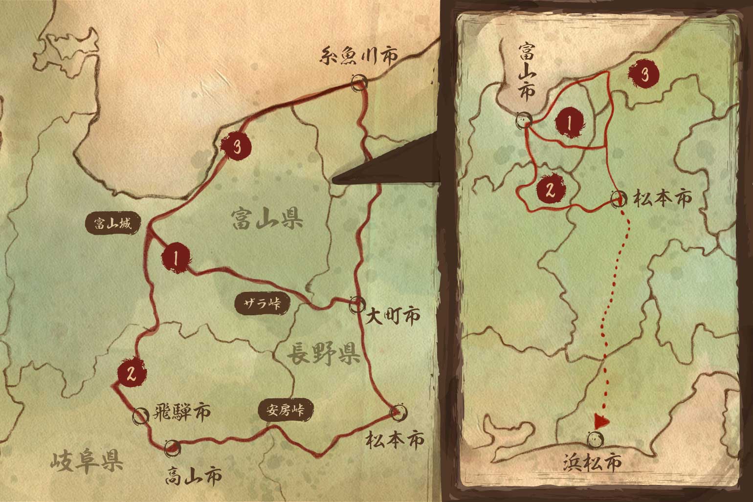 ルートは地図の様に①②③の説があります