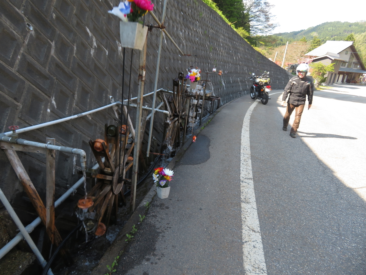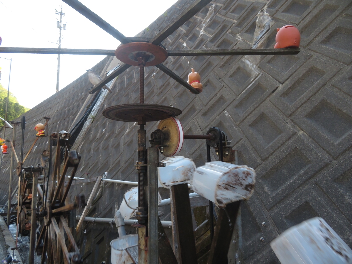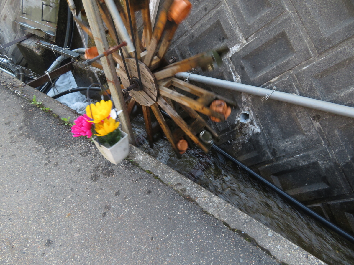 コンクリートブロックのパイプから出ている湧き水を動力として回転