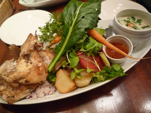 真鯛カマのグリル(焦がしバター味)と、雑穀ごはんと山盛りな農園サラダと里芋のスープ