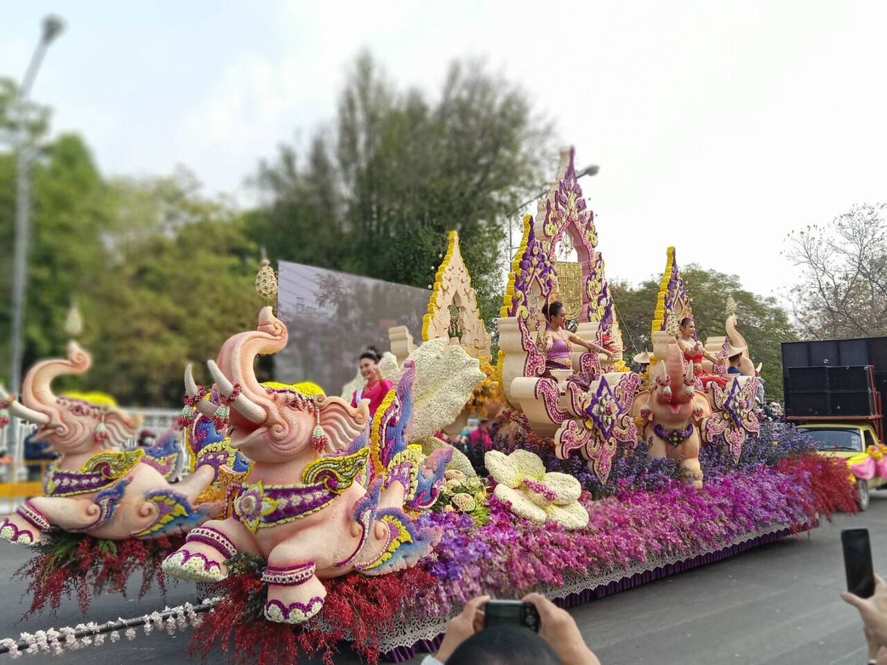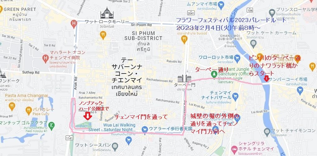 チェンマイフラワーフェスティバルのメインイベントのフラワーフロート(花車)パレードは2023年2月4日(土)の午前8時~約5時間位の予定でピン川に掛かるターペー通りのナワラット橋から旧市街の城壁を囲む堀の外堀のターペー門~チェンマイ門~チェンマイフラワーフェスティバルのメイン会場のノンブアック・ハード公園までの約5㎞の間で行われます。