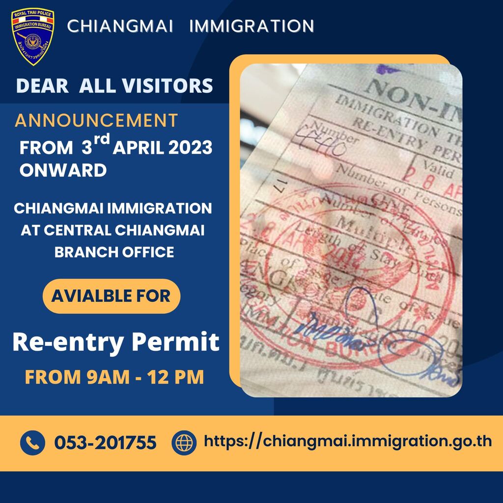 2023年4月3日(月)からセントラルフェスティバルチェンマイ内のイミグレーション分署のリエントリーパーミット(再入国許可)の申請時間がイミグレーション労働日のタイ時間の午前9時~12時までの変更になりました。