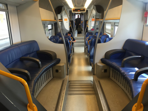 島のローカル線にしては、車内のレイアウトというかデザインがお洒落なのは、さすがイタリアでございますよ。
