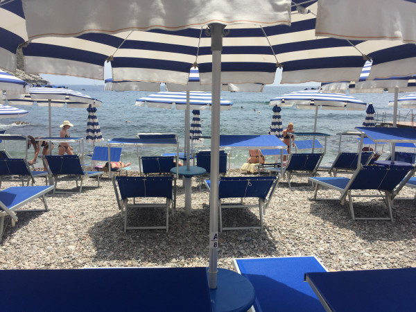 上質なビーチを前に、快適なパラソルの下で食べたのはパニーニ&イタリアンビールのモレッティ。