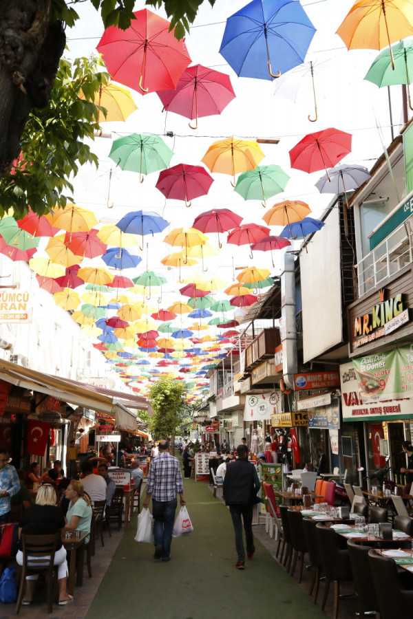 そんな地中海沿岸、ときには商店街までパラソルだらけだったりする。