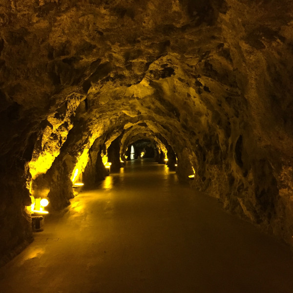 目指すレストランは崖の下。エレベーターで降りると海まで洞窟トンネル!