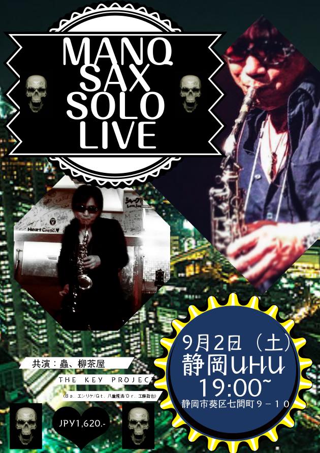 【告知】MANQ SAX SOLO LIVE 20170902 AT UHUライブ告知です。すんまそん 【MANQ SAX SOLO LIVE】 日付:9月2日(土) 場所:静岡UHU 住所:静岡県静岡市葵区七間町9-10 ワイシーシー第二ビルB1 共演:蟲、柳茶屋 THE KEY PROJECT (Ba.エンリケ/Gt.八重樫浩/Dr.工藤哲也) ↑元バービーボーイズだそうです。すごいですね。 開場:18:00 開演:19:00 料金:¥1620 おいらの出演はトップで19:00からです。 なにとぞ宜しくお願い申し上げます。
