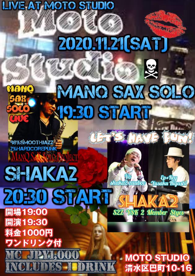 またまた告知でごめんなさい モトスタライブ MANQ SAX SOLO LIVE 日付:2020年11月21日(土) 場所:清水モトスタジオ 住所:静岡市清水区巴町10-16 開場:19:00 開演:19:30 出演 MANQ SHAKA2 出演時間 MANQ 19:30 SHAKA2 20:30 料金:1,000円 ワンドリンク付 コロナ対策は万全! 飛沫防止シート、手指消毒、マスク常備、非接触体温計で体温測定、転換時の換気 人数制限でのディスタンス確保! 今回SHAKA2さんは二人編成の特別バージョンです!普段はノリノリですが、座って聴けるしっとりバージョンかも? ワシはいつものように 自作バックトラックにサックスを吹きますね(^O^) 是非ともご来場ご検討ください! 上記の様なコロナ対策にて人員制限がかかりますので、必ずご来場の際はお店か出演者に予約をお願いします! よろしくお願いします。