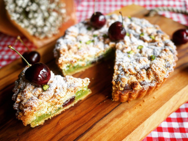 サブレ生地にピスタチオの香りが豊かなアーモンドクリーム、酸味たっぷりのさくらんぼをたっぷり敷き込み、サクサクのクランブルとともに焼き上げました!