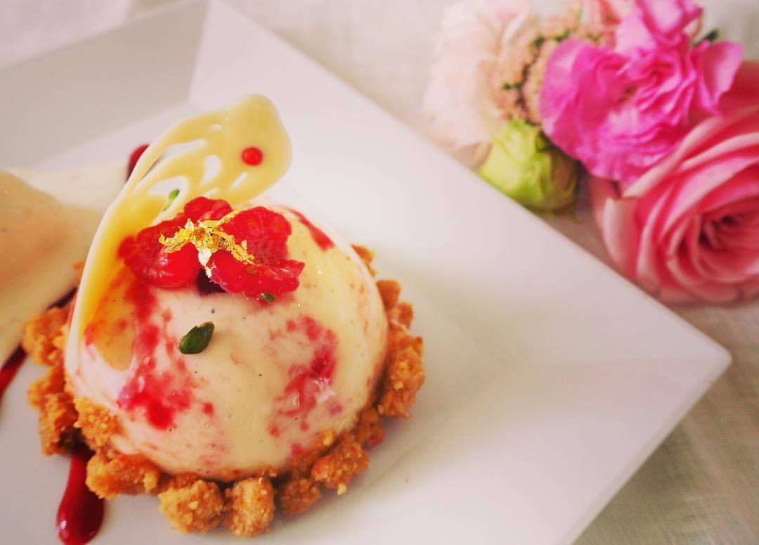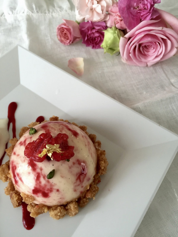 ピンクの蓮の花をイメージし、カシスのジュレとバニラのムース、そしてサクサクのクランブルをアクセントにしたケーキ、バニラアイスも添えてお出しします