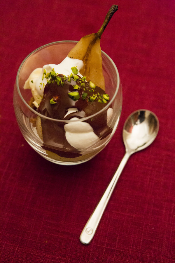 ”美しきエレーヌ”という名前、洋梨のコンポートにチョコレートソースをかけた華やかデザートです