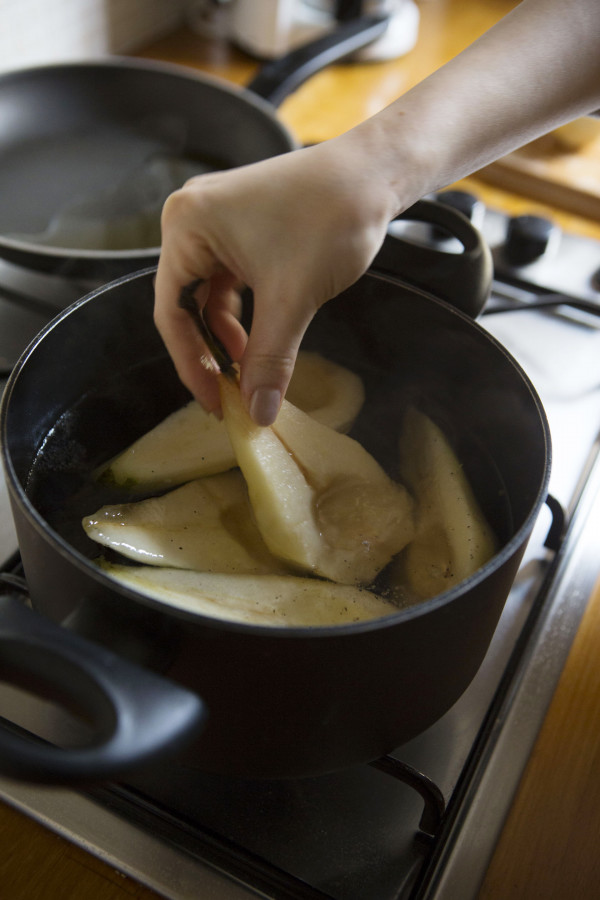 鍋に水、グラニュー糖、裂いたバニラ棒を加え沸騰させ、洋梨を加える