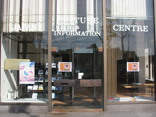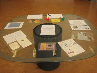 カナダの子供達からの感謝状と、折り紙教室参加者の受付票、ベルギーで広報された私達の新聞記事などを置いたテーブル