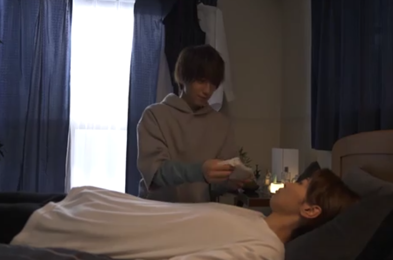 3徹で疲れ果てているフジを気遣い、ベッドで無理やり寝かそうとするドキドキシーン。