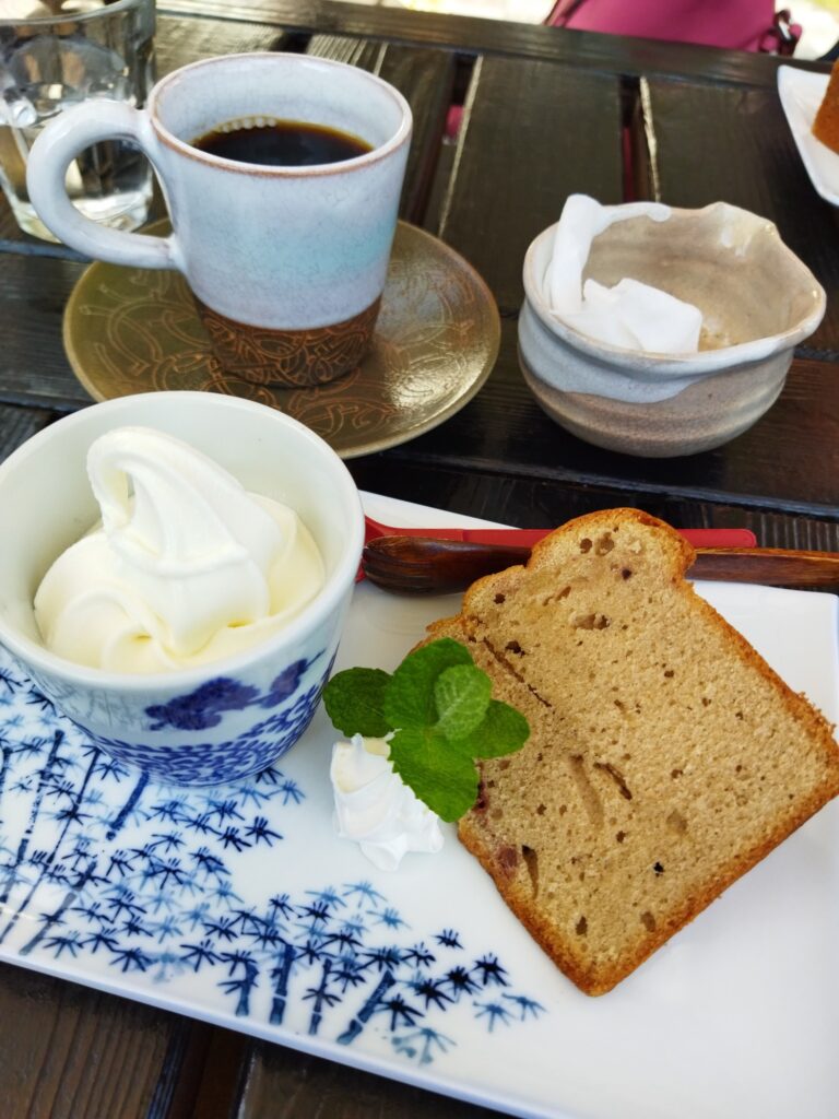 歩き回って小腹も空いていたので、ケーキセットを注文。ケーキは栗のパウンドケーキを選びました。