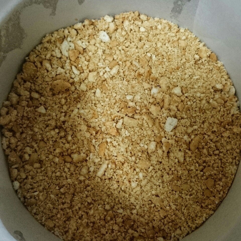 ボトム用クラッカーを砕いて溶かしバターを加える。型紙を敷いた型にコップの底を使って敷き詰めておく。