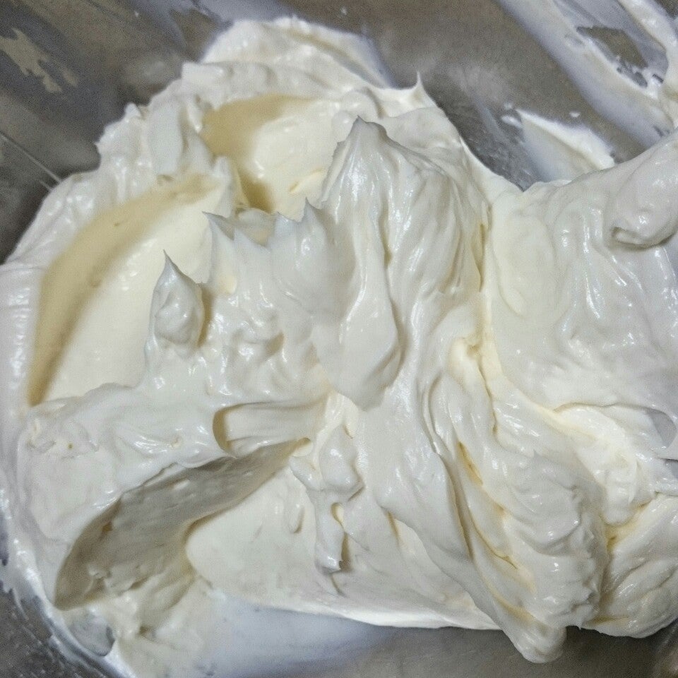 ホイッパーでクリームチーズ滑らかにする。(固いようならゴムヘラで)サワークリームも加えて滑らかにする。