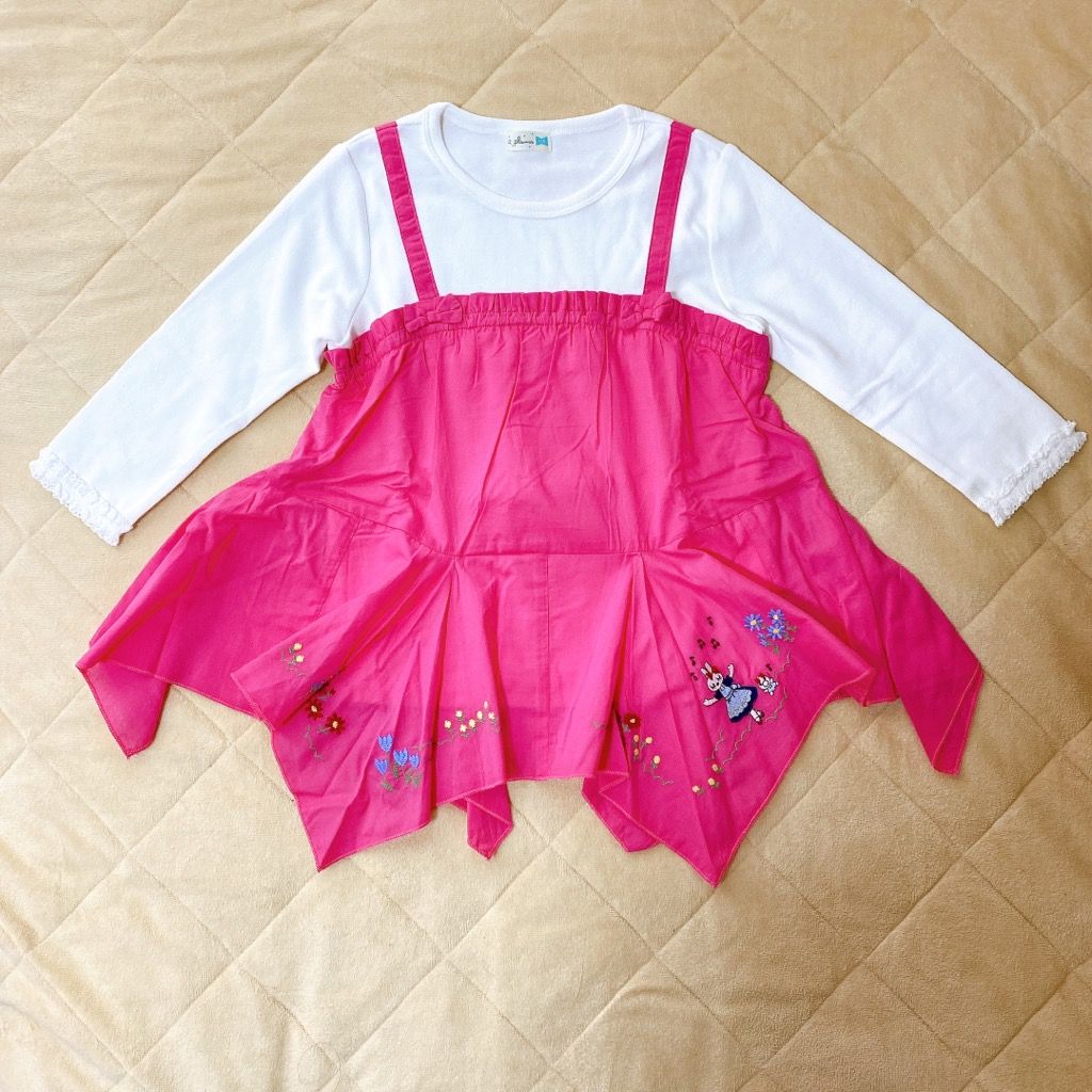 mimiレイヤード風7分丈Tシャツ ピンク 130cm袖が7分丈なので長く着れそうです♪作りは白いTシャツに薄手のピンクの布が縫い付けられている感じです。この洋服前から娘が欲しがっていました。