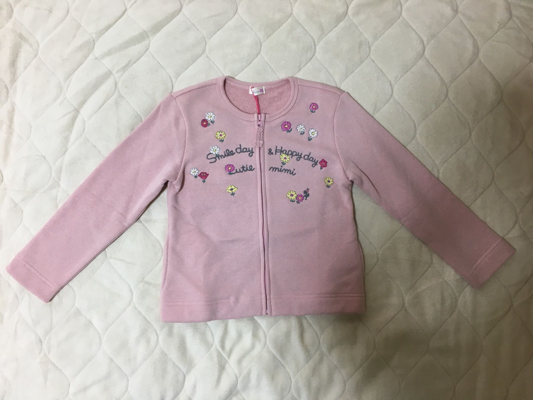 ↑ジップアップカーディガン ピンク 120cm 日本製 フードがないので園や小学校にピッタリです♪実店舗でピンクもグレーもよく売れていてサイズ欠けしてました。