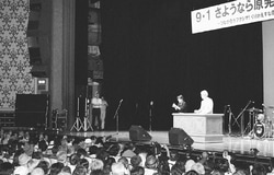 | http://www.jcp.or.jp/akahata/aik13/2013-09-02/2013090204_02_1.jpg (写真)大江健三郎さん(壇上)の講演を聞く参加者=1日、東京・日比谷公会堂