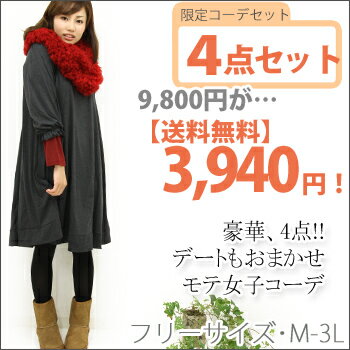 【送料無料】【福袋】袖付きキャメロン・カットソー・ネックウォーマー・レギンス4点コーデSET S~ 大きいサイズ レディース コーデSET ワンピ カットソー タイツ 小物 フリー M L LL 3L