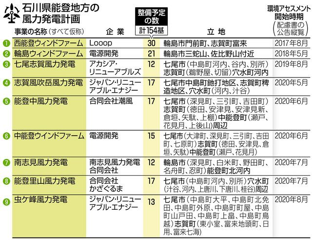 県内の既存の風力発電は全七十四基で、能登地方に七十三基が集中し、他は内灘町に一基のみ。二事業の環境アセスを進める電源開発の広報担当者は「能登は風が強く、大規模な立地が可能なため」と説明する。